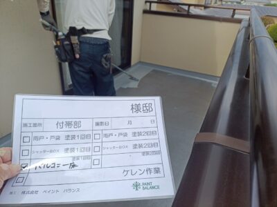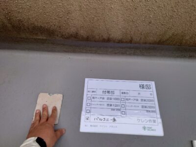 今回のお客様はバルコニーの腰壁部分のクラックと汚れが気になるとの事で、部分塗装のご依頼を頂きました。早速施工前の状態を見ていきましょう。