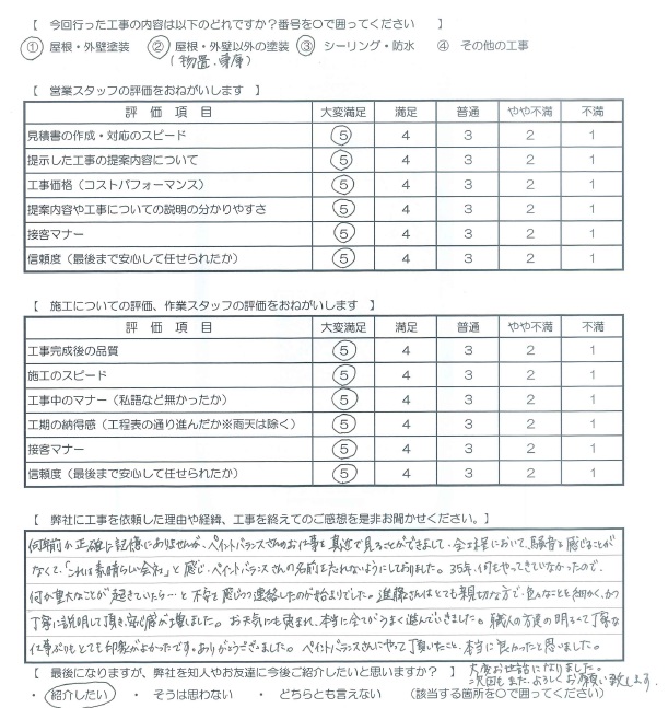 何年前か正確な記憶はありませんがペイントバランスさんのお仕事を真近で見ることができまして、全行程において騒音と感じることがなくて「これは素晴らしい会社」と感じペイントバランスさんの名前を忘れないようにしておりました。35年何もやってきていなかったので何か重大なことが起きていたら・・・と不安を感じつつ連絡したのが始まりでした。進藤さんはとても親切な方で色々なことを細かくかつ丁寧に説明して頂き安心感が増しました。お天気に恵まれ本当に全てがうまく進んでいきました。職人の方達の明るくて丁寧な仕事ぶりもとても印象が良かったです。ありがとうございました。ペイントバランスさんにやって頂いたこと本当に良かったと思いました。大変お世話になりました、次回もまた宜しくお願い致します。