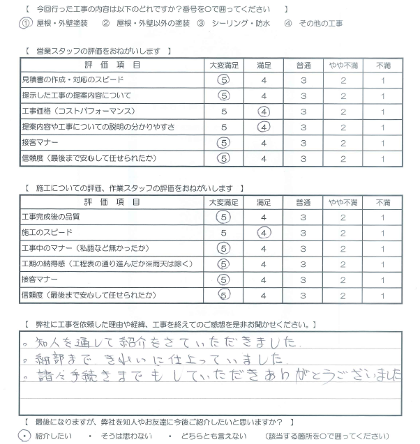 信頼できる知人からの紹介で工事を依頼したので、安心して任せられました。仕上がりも満足しております。